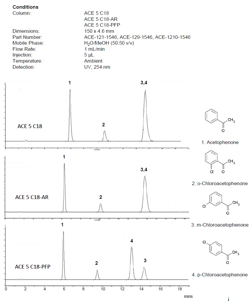 所以,ACE C18-PFP常被用于涉及鹵代芳香族化合物、位置異構(gòu)體和具有不同形狀約束的分析物的分離。