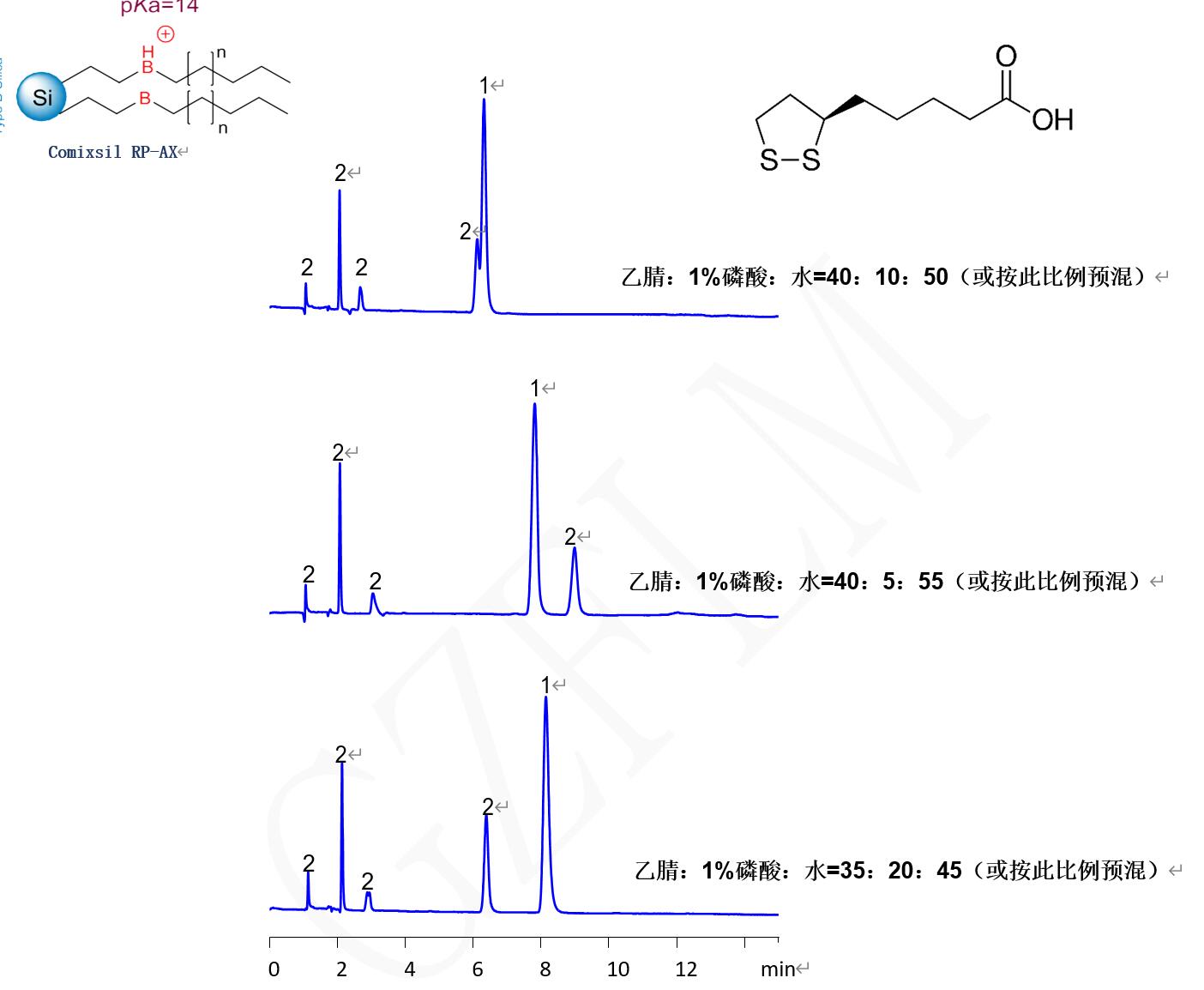 應(yīng)用說明:α-硫辛酸具有疏水基團(tuán)和羧酸基團(tuán),利用 Comixsil RP-AX 與其的疏水作用和離子交換作用保留的分離。