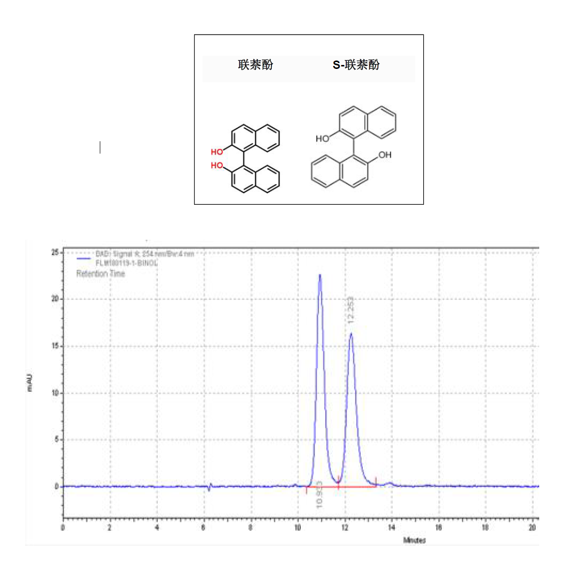 App ID: FLM-B250006 聯(lián)萘酚與S-聯(lián)萘酚的分離 色譜柱:Chiral INC 250*4.6mm,5um (貨號(hào):FMG-JY5-I03) 流速:0.5 mL/min 檢測(cè):波長(zhǎng)254nm, 柱溫:25°C 樣品濃度:N/A 進(jìn)樣量:1μ 溶劑:水:甲醇=40:60(V:V) 流動(dòng)相:咨詢銷售