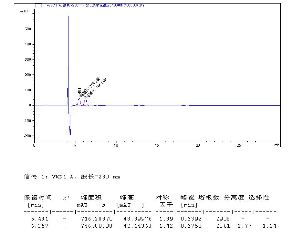 App ID: FLM-B250021 DL-焦谷氨酸的手性分析 方法:自定 色譜柱:Chiral INC 5μm 250×4.6 mm 貨號:FMG-JY5-I03 流速:0.6 mL/min 檢測:UV230nm 樣品濃度:1 mg/mL 進樣量:2 μ 流動相:咨詢 色譜圖: