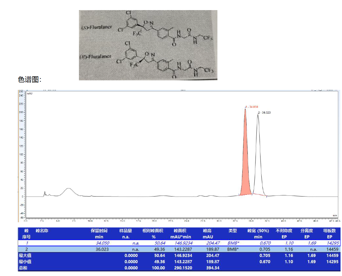 App ID: FLM-B250022 氟雷拉納手性拆分 色譜柱:Chiral MJ(2)-RH 5μ 250*4.6mm( 貨號(hào):FMG-AC5-B03-R) 流動(dòng)相及色譜條件:咨詢